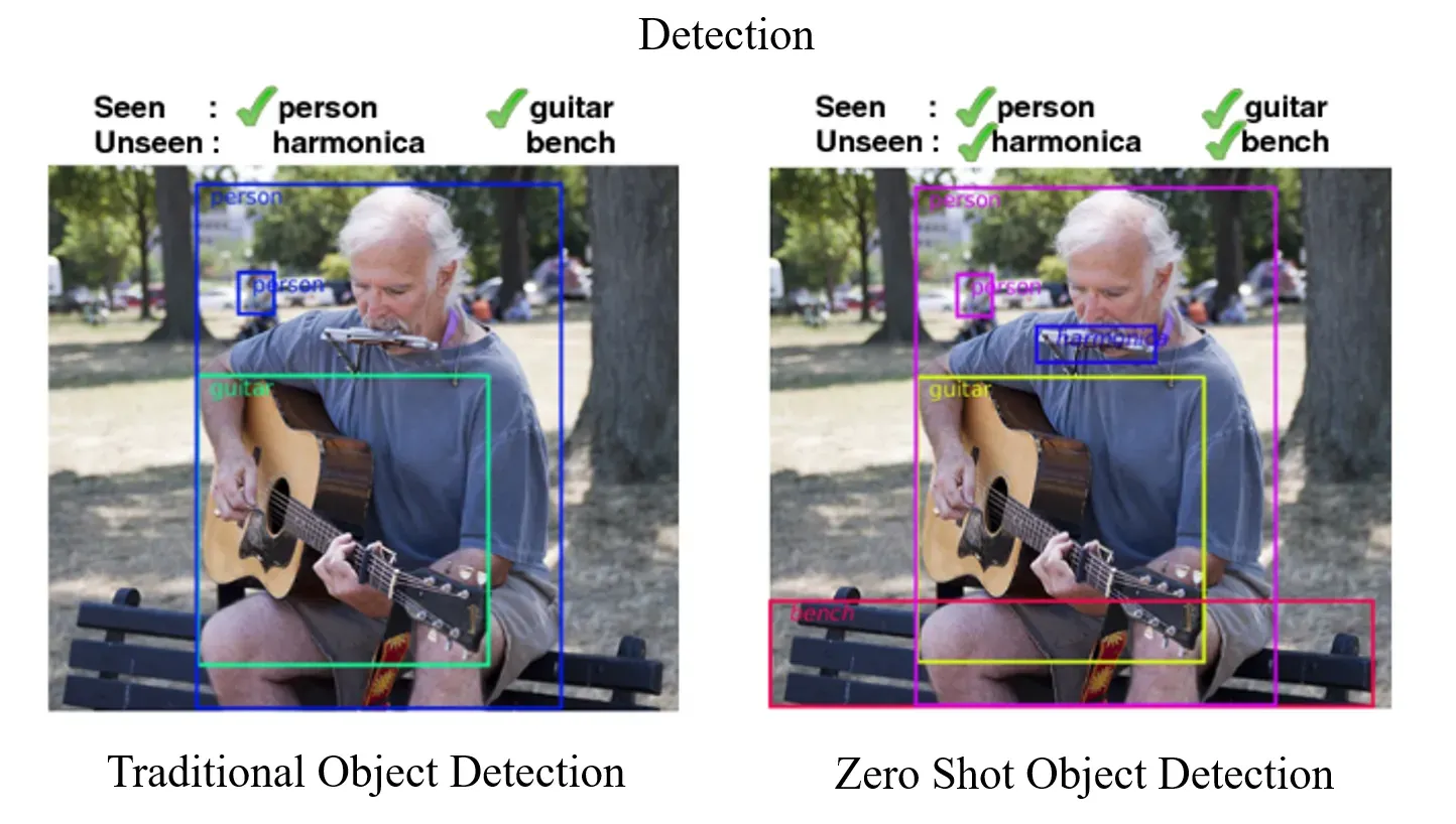Zero-Shot Object Detection (ZSD)은 라벨링된 데이터가 없는 새로운 객체를 탐지하는 기술로 CLIP의 이미지-텍스트 매핑 능력을 활용하여 학습되지 않은 클래스도 탐지할 수 있습니다. 기존의 Object Detection 모델은 고정된 클래스 라벨에 의존하지만 ZSD는 텍스트 설명(예: "파란 물병")을 기반으로 물체를 탐지합니다.